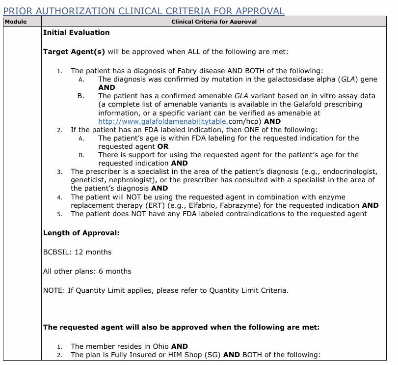 Here’s a coverage policy for Galafold (migalastat), a treatment for Fabry disease, from BCBS Illinois: